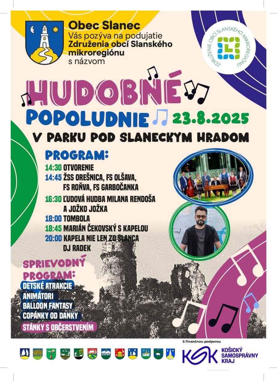 v mene predsedu Združenia obcí Slanského mikroregiónu a zároveň starostu obce Slanec Ing. Jozefa Belu Vás srdečne pozývam na Deň Slanského mikroregiónu, ktorý sa uskutoční už túto sobotu v parku pod Slaneckým hradom. Okrem hlavnej hviezdy večera - Mariána Čekovského vystúpi aj naša folklórna skupina Garbočanka.